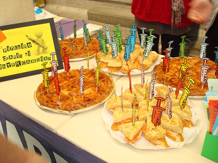 También, el buen uso del Programa de Intercambio de Jeringuillas (P.I.J), con la venta de “Pinchitos saludables” de tortilla de patatas y empanada (al comprar uno y traernos “la jeringuilla” te regalamos el segundo como metáfora de un intercambio de jeringuillas).