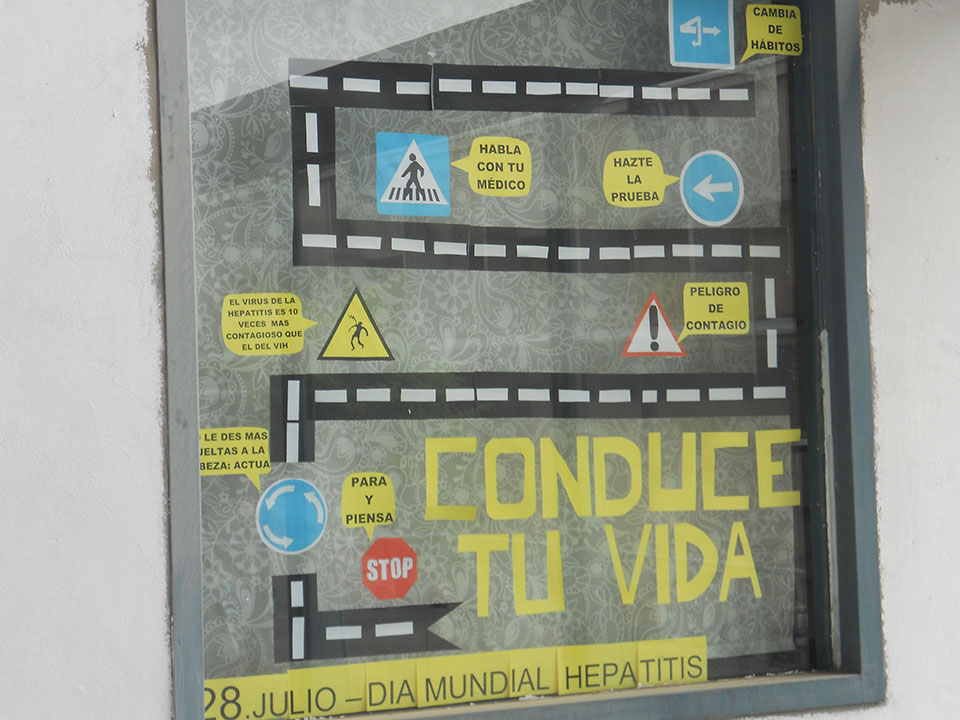 En cuanto al CAS de Brians 1, se trabajó siguiendo el mismo formato: carteles y talleres. En este servicio se utilizó como lema la consigna “CONDUCE TU VIDA”, atribuyendo a los lectores del cartel la responsabilidad de cuidarse ante las hepatitis. Las señales de tráfico dispuestas a lo largo del recorrido anunciaban diferentes recomendaciones a tener en cuenta ante esta enfermedad.