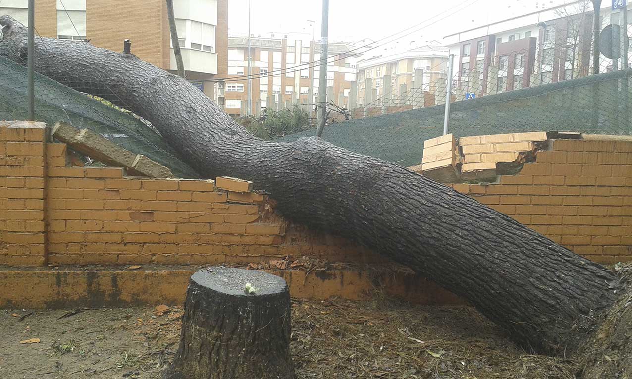 Al comprobar que la situación no mejoraba, que el agua seguía entrando en el edificio y que no era posible achicarla, se decidió desalojar el centro por seguridad de los usuarios/as. Se organizó un dispositivo de vehículos para trasladar al albergue, a quienes así lo quisieron. Y se avisó a los bomberos que, por la saturación de trabajo de esa noche, no llegaron a acudir hasta bien entrada la madrugada, cuando uno de los árboles centenarios del jardín, concretamente un pino, cayó invadiendo la vía pública. Afortunadamente, los daños fueron solo materiales, ya que, de haber pasado en ese momento alguna persona por allí o haber caído el pino en otra dirección, las consecuencias podrían haber sido mucho más graves.