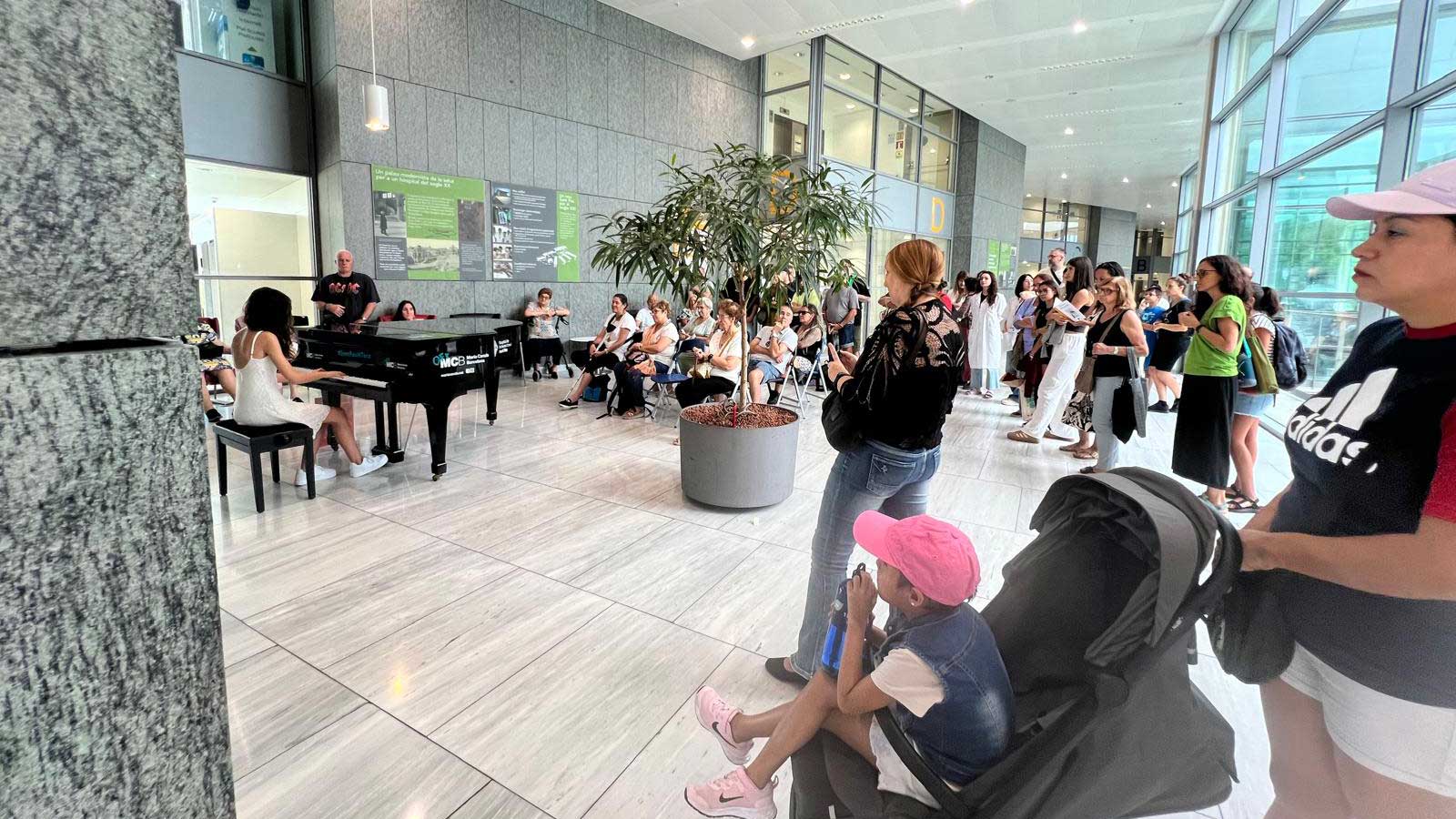 El concierto fue pensado por y para las personas usuarias del centro, como un gesto de gratitud y reconocimiento. Aun así, a la actividad se sumaron también profesionales y personas usuarias del Hospital de Día de Adicciones del Hospital de Sant Pau, con el que el «Centro de Día Crisàlide» mantiene una colaboración habitual, así como pacientes y visitantes que se encontraban en el vestíbulo y se acercaron a compartir este momento. Es importante señalar que las sillas dispuestas por el hospital para la ocasión resultaron insuficientes ante la gran afluencia de personas que acudieron a disfrutar de la armonía del piano.