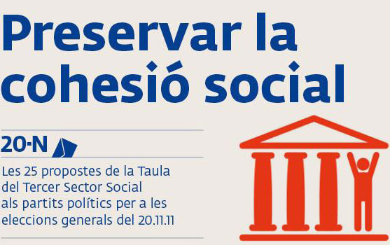 La Taula del Tercer Sector ha publicado el documento ‘Preservar la cohesión social’ donde se recogen 25 propuestas dirigidas a los partidos políticos para que las puedan incluir en sus programas electorales de las próximas elecciones generales del 20 de noviembre.