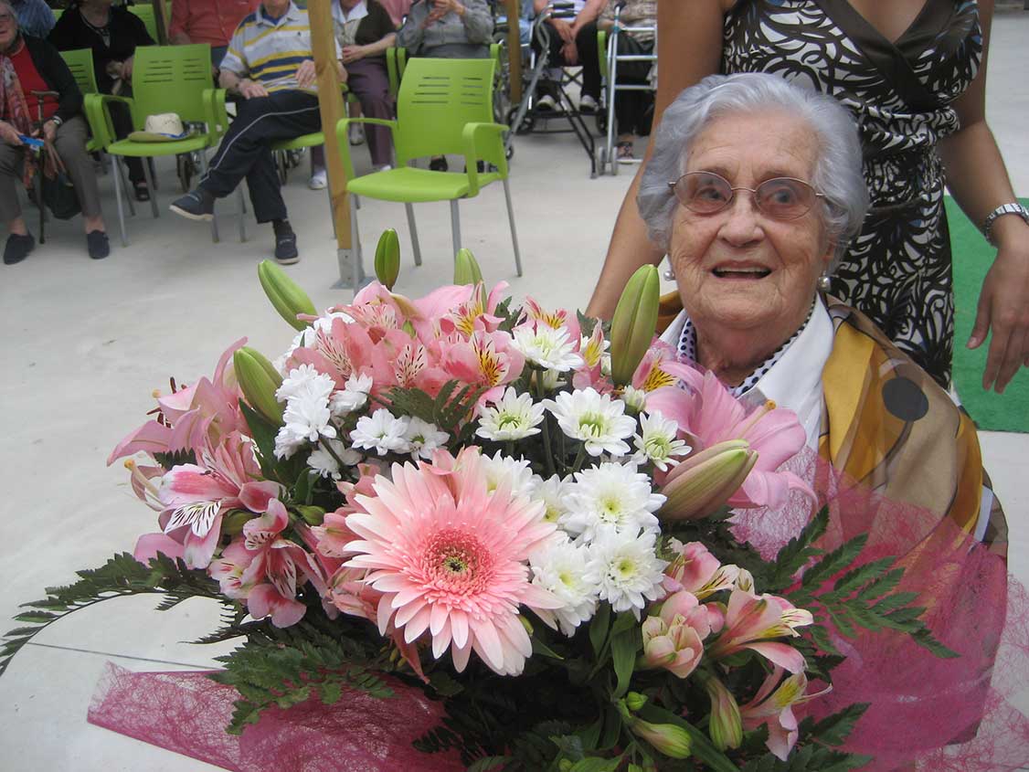 Durante el acto, la residente centenaria recibió el cariño y la felicitación de todos los asistentes, tres espectaculares ramos de flores, un mural y vídeo con fotos representativas de su estancia en la residencia, un cojín con fotos de sus nietos, una placa y una medalla.