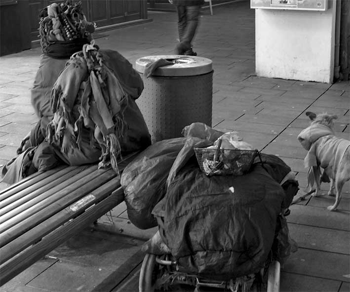 Amanece, me cobijo entre mis mantas. Estoy protegida, no importo a nadie. Estoy aquí, soy una papelera, un semáforo de luces que incordian. Oigo voces, mis luces me hablan, son mis amigas que hablan, hablan, hablan… ¡Callad ya! ¡Dejadme sola en mis mantas! Como cuando quiero y una buena mujer me deja usar el baño. Una pareja azul de servicios sociales vienen a visitarme. A veces vienen, ¿por qué vienen?, ¿por qué hoy vienen de azul? Sonríen, me regalan unos zapatos. Los descoseré y los haré a mi medida, a mis amigas no les gusta el azul. El señor gordo quiere que me marche, no me quiere, solo tengo a mis amigas que hablan… quiero estar sola. Hoy es azul, un lunes azul. Viene la policía, me pide que los acompañe. ¿Por qué?, yo no hago nada malo… La gente me mira. Me abrigo con mi albornoz y mis guantes blancos. Me llevan, ¿dónde voy?, ¿y mis cosas? El edificio es muy ruidoso, todos hablan y me preguntan, mis amigas también hablan, quieren que les cuente mi vida, mi intimidad, mi tristeza, mi soledad, ¡por qué no me dejan en paz!