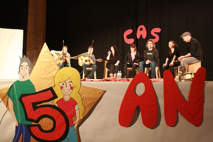 Després de les presentacions de tots els components de l’equip del CAS, es va procedir a les actuacions preparades per l’aniversari presentades per l’equip del CAS i alguns usuaris del servei. En primer lloc, va tenir lloc una actuació musical protagonitzada per un usuari del CAS, a continuació vam gaudir d’un monòleg d’humor a càrrec de Carles Flavià i, finalment, una actuació musical del grup “Jam Flamenc Bcn”.