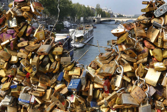 Ha estat notícia en les últimes setmanes que diversos ponts de París amenaçaven de provocar accidents per ensorraments, en estar sotmesos al pes de centenars o milers de cadenats que els enamorats adherien a les seves baranes. Concretament, un panell de la barana del Pont des Arts de París sobrecarregat amb 700 quilos d’acer, ferro i altres aliatges amoroses d’alumini es va desprendre, i afortunadament no va caure sobre el cap de cap turista dels que passaven per sota en les múltiples embarcacions que naveguen pel Sena. L’Ajuntament de París ha proposat als visitants que, en lloc de col·locar un cadenat al pont (escrivint-hi els seus noms o inicials, tancant-lo i llançant la clau al riu), es facin una fotografia junts i la pengin en una pàgina web creada a l’efecte. Tot això sota l’eslògan “amor sense cadenats”.