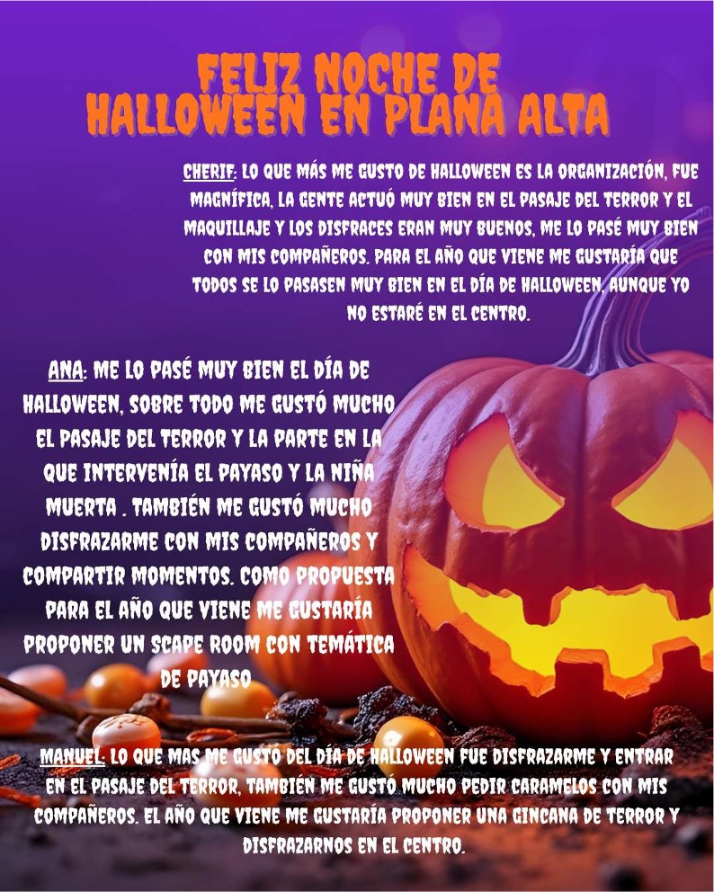 Ana va explicar que s’ho va passar molt bé el dia de Halloween, sobretot li va agradar el Passatge del Terror. Un dels moments més impactants que va descriure va ser la intervenció dels personatges del pallasso i la “nena morta”, a més de la possibilitat de compartir experiències, disfressada amb els seus companys/es. “Com a proposta per a l’any que ve, m’agradaria que es fes un scape room (joc d’escapament) amb temàtica de pallasso”, ens explicava.