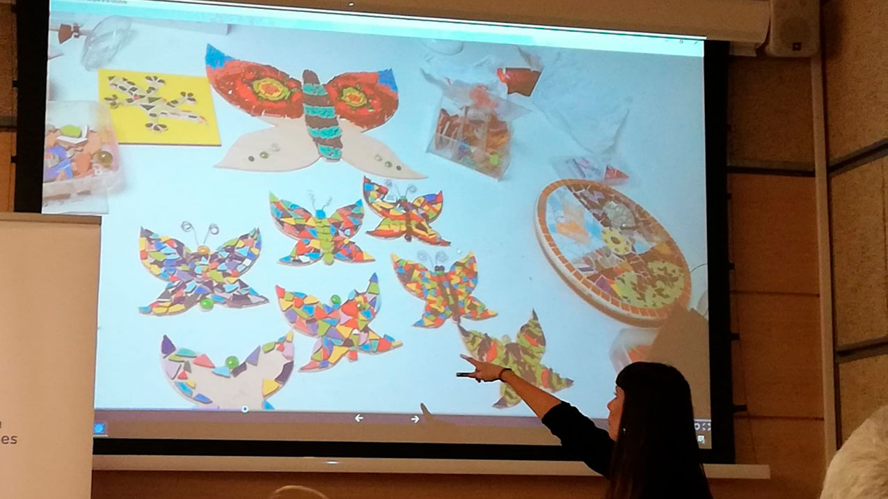 Estas actividades van enlazadas con la posibilidad de poder visitar distintos lugares de la ciudad de Barcelona, trasladar esta experiencia a una posterior reflexión y al trabajo relacionado con ello. En este sentido, destacó los “vitrales”, figuras realizadas después de la visita del grupo al Parque Güell, lugar en el que las personas usuarias podían plasmar, normalmente con el dibujo de la mariposa como símbolo de transformación, un conjunto de “vitrales”, escogiendo tanto forma, como colores o tamaño. Además, Neus Montserrat, explicó que con este trabajo se trataba de crear un espacio donde se pudiera trabajar tanto lo emocional, como lo artístico, como lo grupal y el entorno (ciudad).