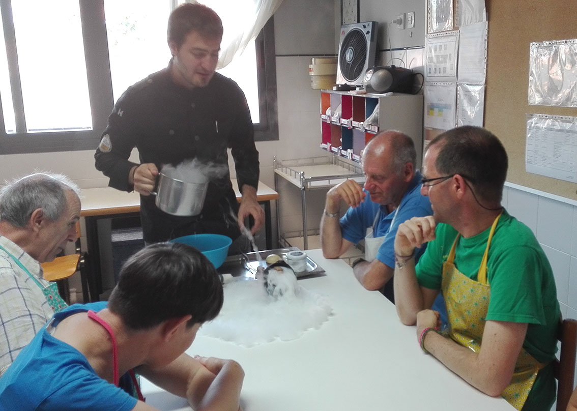 Así recibieron los participantes de esta actividad que cuenta con tan buena acogida en el centro a un conocido chef navarro que quiso compartir con ellos/as una de sus actividades favoritas. Los usuarios/as del servicio “Valle del Roncal” realizan este Taller de Cocina, de martes a jueves. Un grupo de 8 personas prepara un menú especial que elabora con gran esmero en este taller. Y, por supuesto, una vez cocinados los diferentes platos, también los degustan.
