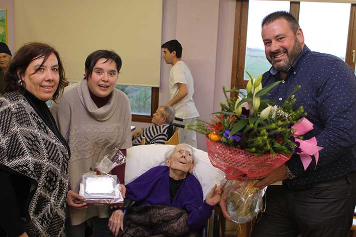 Durante el transcurso del acto, la alcaldesa de Yécora le hizo entrega de una insignia, la primera con la que el Ayuntamiento de la localidad obsequia a una persona centenaria, y el alcalde de Kripán de un ramo de flores. La emoción en esos instantes era muy grande, según nos explica Marta Gerrikaetxebarria, directora del centro.