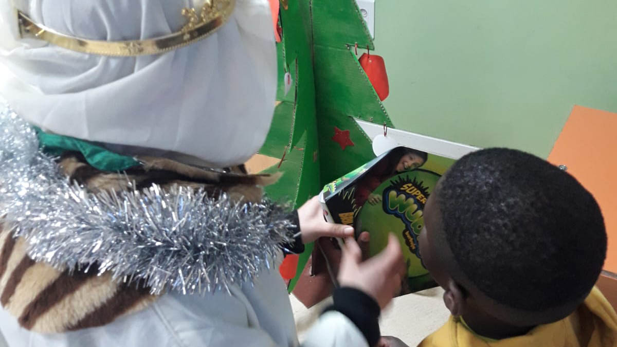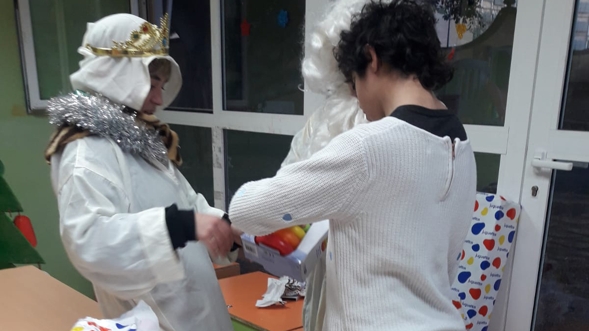 Concretamente, el Rey Melchor y su Paje repartieron los 8 regalos que los niños, niñas y adolescentes habían pedido con mucha ilusión. Cuando aparecieron por la puerta de la sala del centro, algunos de los niños y niñas los reconocieron y saltaron de alegría. Todas y todos esperaron, sentados y con buen comportamiento, a que les llamaran por su nombre para recibir su regalo.
