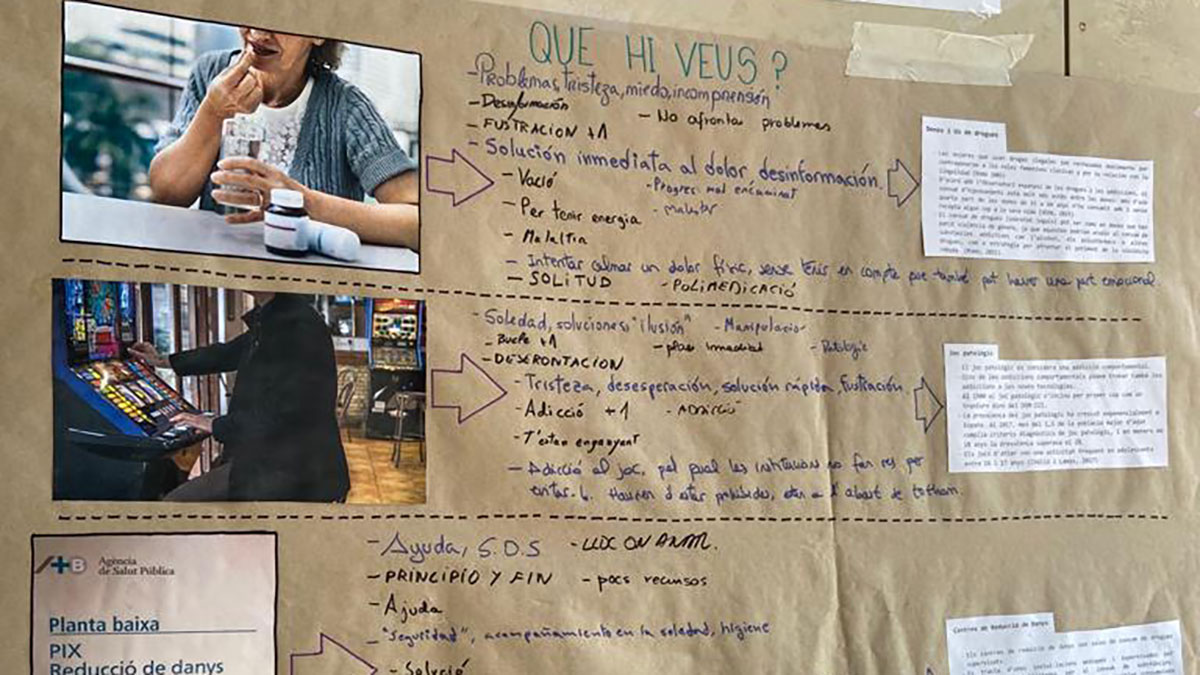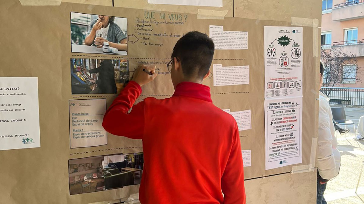 La actividad, denominada “Haz fuera el estigma, infórmate”, proponía a todas las personas participantes hacer un recorrido por distintas imágenes dispuestas en un mural, observarlas detenidamente, escribir en el mismo mural una palabra (o varias) que ejemplificaran lo que generaba la fotografía y leer, a continuación, un esquema informativo sobre la realidad de los estigmas relacionados con el uso de drogas (a partir de un material editado por la Federación Catalana de Drogodependencias). Las imágenes mostraban el juego patológico de las mujeres y el uso de drogas, de los centros de reducción de daños y de los pisos terapéuticos.