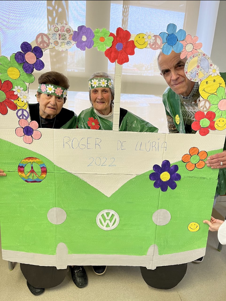 Por otra parte, decidieron qué tipo de photocall querían crear y posteriormente disfrutar. “Les dimos diferentes opciones, de las cuales escogieron una furgoneta hippie, que una vez diseñada, ellos/as decoraron. Una vez pintados todos los dibujos hippies, los usuarios/as se encargaron de recortarlos. Lo siguiente fue recortar los trajes, elegimos realizar chalecos y cintas de pelo, el equipo psicosocial dibujó los patrones en bolsas de basura y las personas mayores las recortaron. Con ello, se trabajó la coordinación bimanual, la coordinación óculo-manual, la motricidad fina y la atención”, nos trasladan desde el centro.
