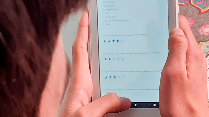 Utilizando tablets distribuidas en el centro, los niños, niñas y adolescentes (NNA), valoran sistemáticamente en una escala de entre una a cinco estrellas, diferentes aspectos de la actividad en la que han participado, como el grado de preparación de la sesión por parte de el/la profesional, los materiales empleados o la utilidad percibida de los contenidos para su futuro desarrollo personal.