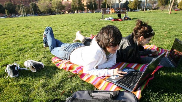 Varias jóvenes con sus ordenadores portátiles tumbadas en un parque. (DNA)
